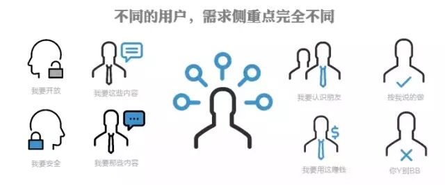 比如,同样是一款社交产品,商务人士看重安全、隐私,文艺青年注重气质、氛围;95后看重新潮;中老年看重操作简单、可看家人照片;企业用户看重工作协同;约炮用户一定要有查看附近的人等这些不同的用户群需求,很难在最开始的时候同时满足好,尤其对于一个创业公司来说。